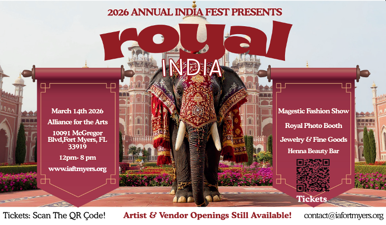 India Association of Fort Myers (IAFM) is pleased to announce the upcoming India Fest 2026. The event will be held on Saturday, March 14th, 2026, at the Alliance for the Arts, located at 10091 McGregor Blvd, Fort Myers, FL 33919. We warmly invite you to join us in celebrating the India Festival.